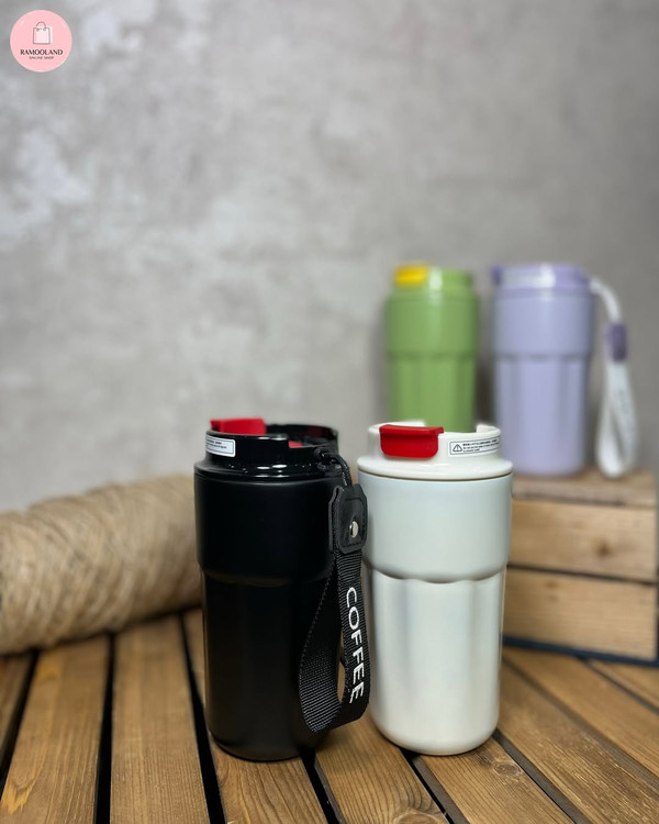 جنس بدنه استیل مات جنس داخل استیل دوجداره 304 دارای لبی آسان نوش بند دار بدون نشتی